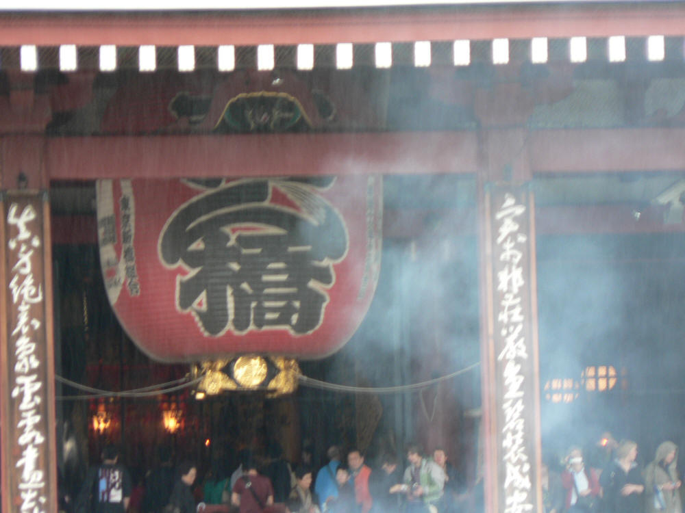 A closer look at the lantern entrance of the temple, with incense smoke...